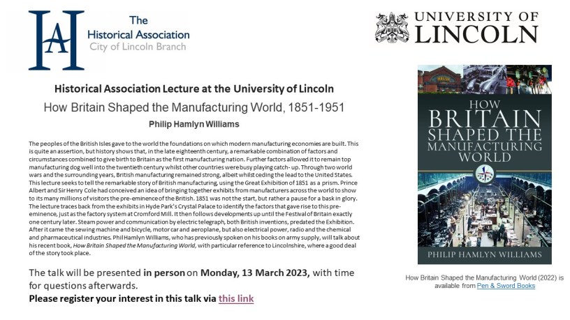 I am really looking forward to talking about How Britain Shaped the Manufacturing World to the City of Lincoln branch of the Historical Association. I will be looking in particular at the Lincoln and Lincolnshire connections.